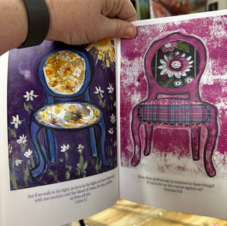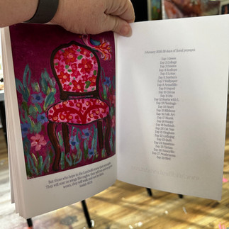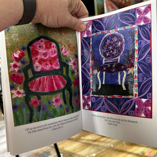 The really special product is the booklet. I did not set out to make a booklet. But they all looked so sweet in a grouping I decided to do a little more with them. I have all 28 prompt chairs, plus the additional one on the cover. Each page has scripture under the individual chair. It falls in the range as more than a card and less than a hardback book. They have been printed on a 60lb matte finish paper. Booklets are $12 each, or $10 each if you are purchasing more than 1. Shipping is $7 per book.